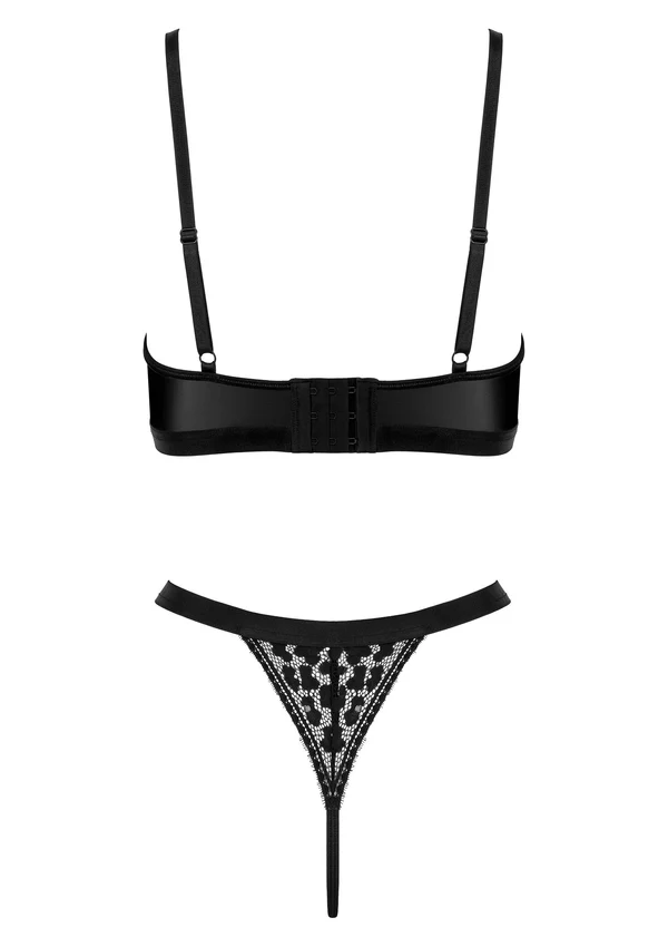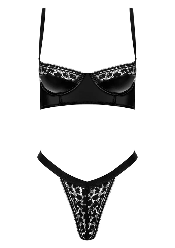 Sensueel, verleidelijk en elegant – deze adembenemende 2-delige bh-set gemaakt van glanzend wet-look stof en delicaat kant benadrukt perfect vrouwelijke rondingen. Het glinsterende natte materiaal in combinatie met fijn, transparant kant zorgt voor een onweerstaanbaar contrast dat zowel vet als luxueus is. De BH heeft beugels voor optimale ondersteuning en natuurlijke vormgeving, met verstelbare bandjes en een drievoudige haak-en-oogsluiting voor een persoonlijke pasvorm.