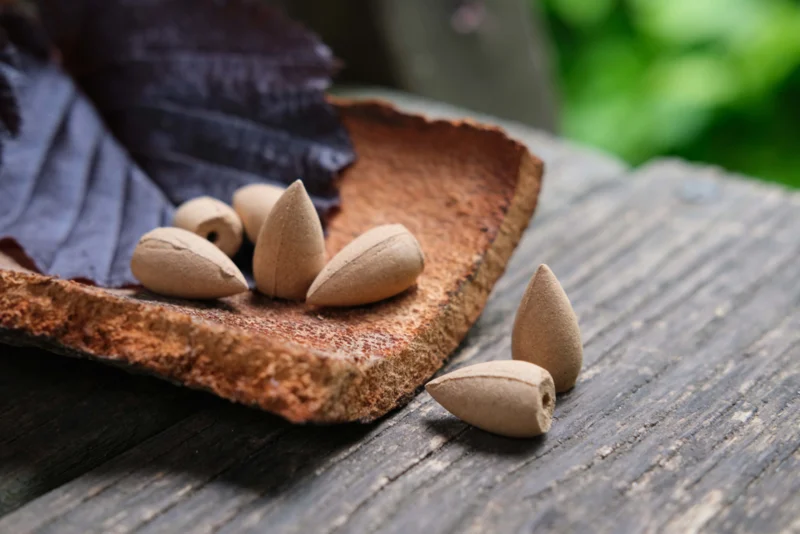 Steek de punt van de kegel aan met een lucifer, aansteker of conus, blaas de vlam uit en laat de wierookkegel de ruimte vullen met een fantastisch aroma.