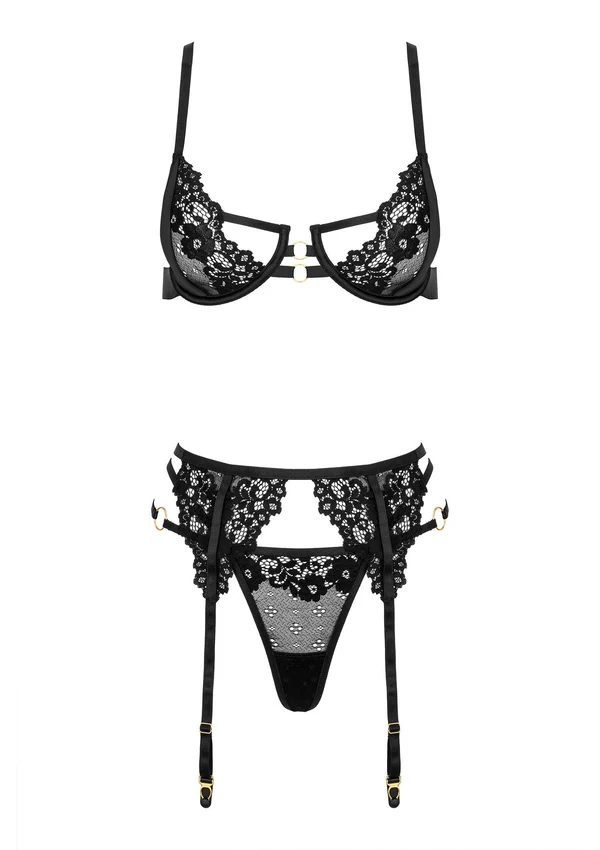 Deze charmante en verleidelijke set combineert het beste van klassiek en modern design en straalt een ongelooflijk luxe uitstraling uit. Gemaakt van hoogwaardig kant en elegant satijn, straalt de set elegantie en verfijning uit. De BH sluit aan de achterkant vast met een haak-en-oogsluiting, wat zowel stabiliteit als comfort biedt. Verstelbare banden zorgen voor een perfecte pasvorm en maximaal comfort. Bodems tillen de buste op en accentueren het decolleté op een flatterende manier. Het kant is ontworpen om subtiele glimpen te bieden en biedt toch uitstekende ondersteuning. Met de bijgevoegde verstelbare jarretels kunt u naar wens kousen bevestigen. De bijpassende string past perfect bij de set. Houd er rekening mee dat kousen niet zijn inbegrepen.