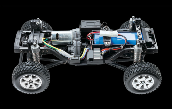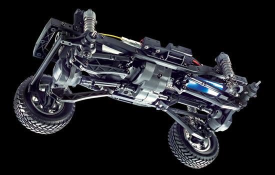 • Configuratie met vierwielaandrijving met motor achter de voorkant, met afzonderlijke transmissie- en transferbox en cardanusbanden die stroom naar voor- en achterverschillen overbrengen.