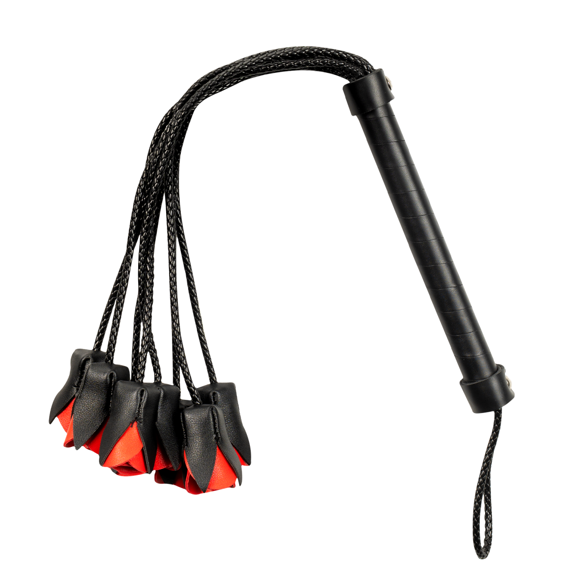 De diepzwarte basis en vurige rode rozen maken deze zweep een echte blikvanger in elke speelse setting.