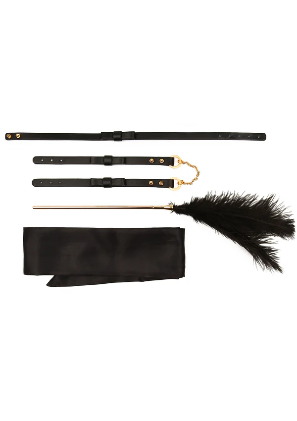 Duik in de sensatie van speelse verleiding met de 4 PCS TABOOM Desires Tease Bondage Set – compleet met een verleidelijke kraag, flirterige polsboeien, zijdeachtig bondagelint en een verenkieter die plaagt bij elke verleidelijke aanraking.